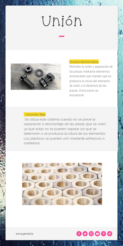 Uniones fijas Se utiliza este sistema cuando no se prevé la separación o desmontaje de las piezas que se unen, ya que estas no se pueden separar sin que se deterioren o se produzca la rotura de los elementos. Los plásticos se pueden unir mediante adhesivos o soldadura.