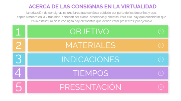la redacción de consignas es una tarea que conlleva cuidado por parte de los docentes y que, especialmente en la virtualidad, deberían ser claras, ordenadas y directas. Para ello, hay que considerar que en la estructura de la consigna hay elementos que deben estar presentes; por ejemplo