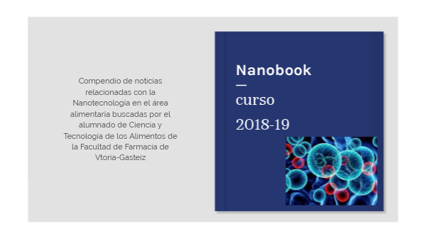 Este “Nanobook” forma parte de una iniciativa desarrollada en el seno de la asignatura Nanociencia y Nanotecnología, impartida en el tercer curso del grado en Ciencia y Tecnología de los Alimentos de la Facultad de Farmacia de Vitoria-Gasteiz. Esta iniciativa ha consistido en la creación de un foro dentro de la plataforma educativa eGela y pretende ser el lugar de envío y comentarios de noticias semanales sobre nanotecnología presentadas por el alumnado en el aula. Con todas ellas se ha creado este "Nanobook“ del curso 2018-19 que recopila todas las noticias que han ido apareciendo, junto con sus fuentes y el año de publicación.
