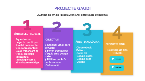 Aquest és un projecte que té per finalitat conèixer la vida i obra d'Antoni Gaudí mitjançant el treball en equip utilitzant la tecnologia com a eina d'aprenentatge.