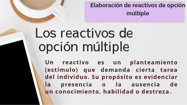 Un reactivo es un planteamiento (estímulo) que demanda cierta tarea del individuo. Su propósito es evidenciar la presencia o la ausencia de un conocimiento, habilidad o destreza.