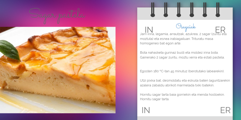 Jarri irina, legamia, arrautzak, azukrea, 2 sagar (zuritu eta moztuta) eta esnea irabiagailuan. Trituratu masa homogeneo bat egon arte. Bota nahasketa gurinaz busti eta moldez irina bota. Gainerako 2 sagar zuritu, moztu xerra eta estali pastela. Egosten 180 ºC-tan 45 minutuz (berotutako labearekin). Utzi pixka bat, desmoldatu eta eskuila baten laguntzarekin azalera zabaldu abrikot marmelada txiki batekin. Hornitu sagar tarta baia gorriekin eta menda hostoekin. Hornitu sagar tarta.