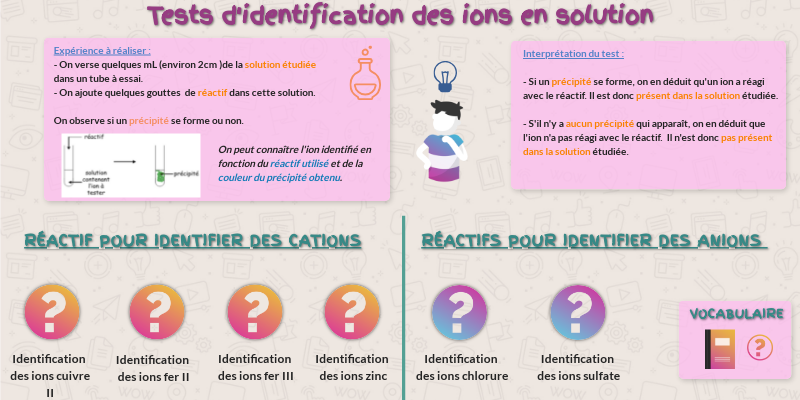 Interprétation du test : - Si un précipité se forme, on en déduit qu'un ion a réagi avec le réactif. Il est donc présent dans la solution étudiée. - S'il n'y a aucun précipité qui apparaît, on en déduit que l'ion n'a pas réagi avec le réactif. Il n'est donc pas présent dans la solution étudiée.