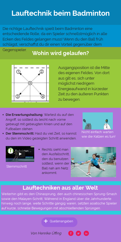 Die richtige Lauftechnik spielt beim Badminton eine entscheidende Rolle, da ein Spieler schnellstmöglich in alle Ecken des Feldes gelangen muss! Wenn du den Ball früh schlägst, verschaffst du dir einen Vorteil gegenüber dem Gegenspieler.