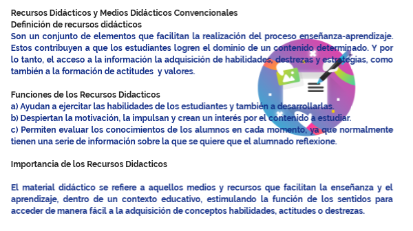 Recursos Didácticos y Medios Didácticos ConvencionalesDefinición de recursos didácticos Son un conjunto de elementos que facilitan la realización del proceso enseñanza-aprendizaje. Estos contribuyen a que los estudiantes logren el dominio de un contenido determinado. Y por lo tanto, el acceso a la información la adquisición de habilidades, destrezas y estrategias, como también a la formación de actitudes y valores. Funciones de los Recursos Didacticos a) Ayudan a ejercitar las habilidades de los estudiantes y también a desarrollarlas. b) Despiertan la motivación, la impulsan y crean un interés por el contenido a estudiar. c) Permiten evaluar los conocimientos de los alumnos en cada momento, ya que normalmente tienen una serie de información sobre la que se quiere que el alumnado reflexione. Importancia de los Recursos Didacticos El material didáctico se refiere a aquellos medios y recursos que facilitan la enseñanza y el aprendizaje, dentro de un contexto educativo, estimulando la función de los sentidos para acceder de manera fácil a la adquisición de conceptos habilidades, actitudes o destrezas.