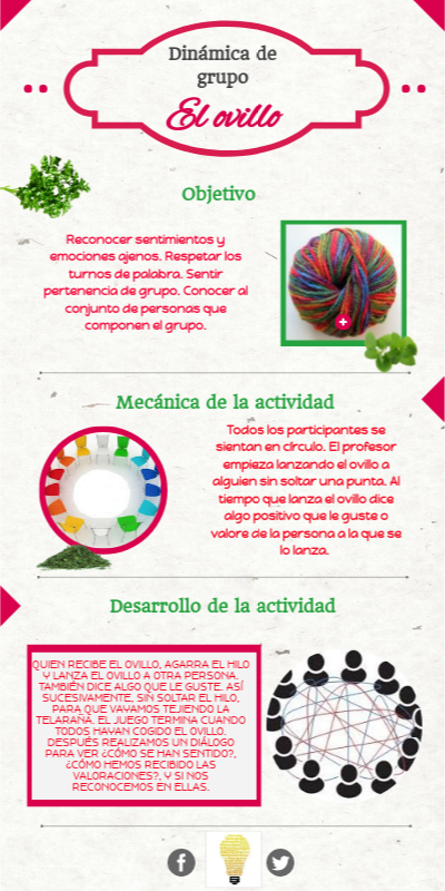 Todos los participantes se sientan en círculo. El profesor empieza lanzando el ovillo a alguien sin soltar una punta. Al tiempo que lanza el ovillo dice algo positivo que le guste o valore de la persona a la que se lo lanza.