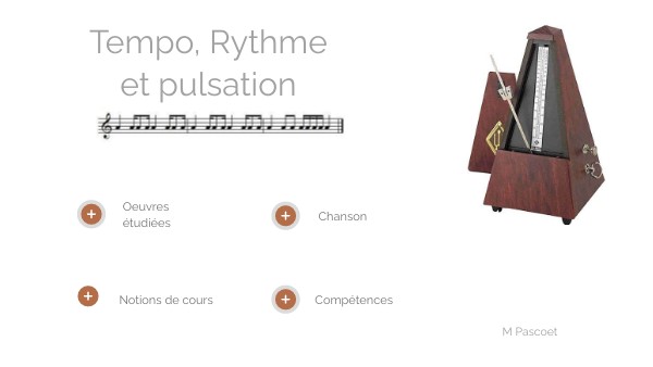 La pulsation est un battement régulier qui fait vivre la musique(trouvez la pulsation sur ces différents morceaux) La vitesse de cette pulsation s'appelle le tempo. Le Rythme est la durée des notes (ces durées sont relatives à la vitesse de la pulsation)