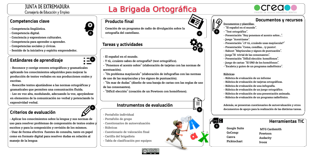 Documentos y plantillas: - "El español en el mundo". - "Test ortográfico". - Presentación "Hoy ponemos el acento sobre...". - Juego "Acentúame". - Presentación "¿Y tú, ¿cuándo usas mayúscula?" - Presentación "Coma, comillas... ¡y punto!. - Kahoot "Mayúsculas y signos de puntuación". - Juego"El trivial de las consonantes". - Presentación "Difícil elección: homófonos". - Juego de cartas: "El UNO de los homófonos". -"Escaleta y guion de un programa radiofónico". Rúbricas: - Rúbrica de evaluación de un informe - Rúbrica de evaluación de tarjetas ortográficas. - Rúbrica de evaluación de una infografía. - Rúbrica de evaluación de un juego ortográfico. - Rúbrica de evaluación de una presentación animada. - Rúbrica de evaluación de un programa radiofónico. Además, se presentan cuestionarios de autoevaluación y otros documentos de apoyo para la realización de las distintas tareas.