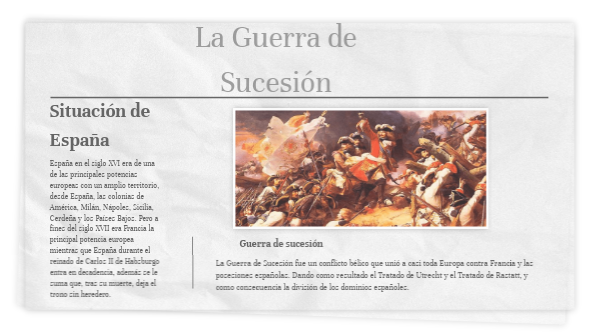 La Guerra de Sucesión fue un conflicto bélico que unió a casi toda Europa contra Francia y las posesiones españolas. Dando como resultado el Tratado de Utrecht y el Tratado de Rastatt, y como consecuencia la división de los dominios españoles.