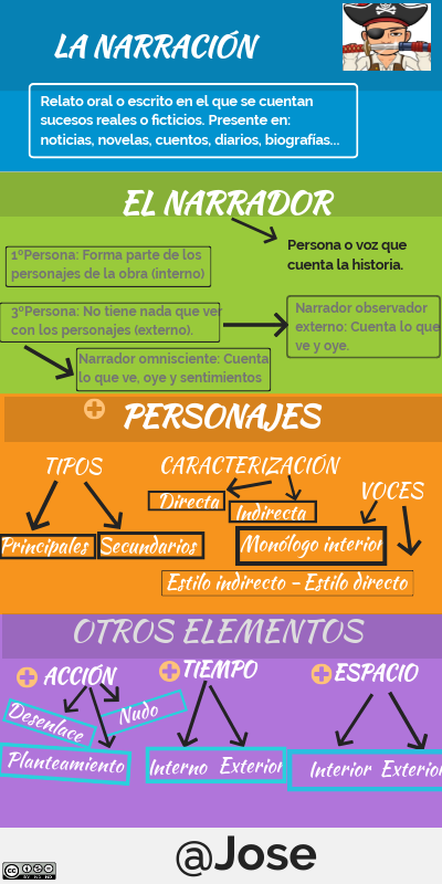 Relato oral o escrito en el que se cuentan sucesos reales o ficticios. Presente en: noticias, novelas, cuentos, diarios, biografías...