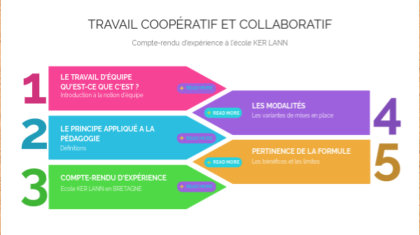 Le principe appliqué à la pédagogie Le travail de groupe apparaît dans plusieurs courants pédagogiques, et notamment le socio-constructivisme, comme un élément important dans le processus d’apprentissage. Comme je l’écrivais dans un précédent article ( « Evaluation des compétences » ), s’appuyer sur ces courants de pensées peut être pertinent dans la mise en place parallèle du système traditionnel : d’activités collectives (exposés, recherches, études). Il s’agit pour les élèves d’apprendre et ou parfaire des connaissances en coopérant par équipe sous la direction de l’enseignant qui orchestre - mais ne dirige pas - les conditions pour que les interactions entre élèves se déroulent correctement et efficacement. En effet, la structuration des activités coopératives vise à renforcer des interactions simultanées entre l’ensemble des élèves en veillant à favoriser une participation égale de tous. Le fait d’engager tous les élèves dans des activités cognitives - sous tendues par les interactions sociales - devient une dynamique de relance ou de progression dans les apprentissages.