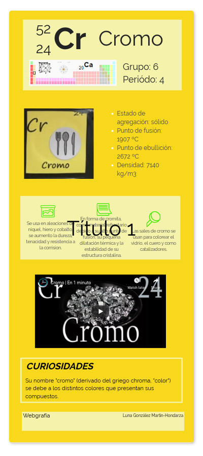 Su nombre "cromo" (derivado del griego chroma, "color") se debe a los distintos colores que presentan sus compuestos.