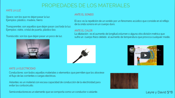 ANTE LA LUZOpaco: son los que no dejan pasar la luz.Ejemplos: plástico, madera, hierroTransparentes: son aquellos que dejan pasar casi toda la luz.Ejemplos: vidrio, cristal de puerta, plástico liso.Translúcido: son los que dejan pasar un poco de luz.