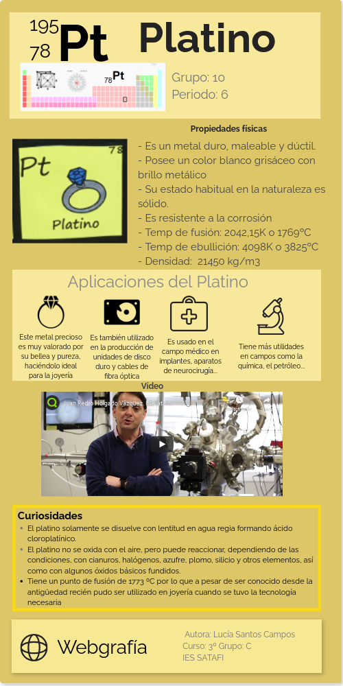 - Tiene un punto de fusión de 1773 ºC por lo que a pesar de ser conocido desde la antigüedad recién pudo ser utilizado en joyería cuando se tuvo la tecnología necesaria