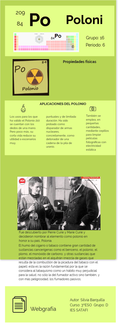 Fue descubierto por Pierre Curie y Marie Curie y decidieron nombrar al elemento como polonio en honor a su pais, Polonia.