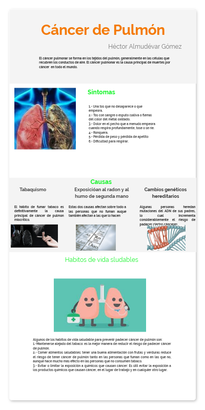 Algunos de los habitos de vida saludable para prevenir padecer cáncer de pulmón son:1.-Mantenerse alejado del tabaco: es la mejor manera de reducir el riesgo de padecer cáncer de pulmón. 2.- Comer alimentos saludables: tener una buena alimentación con frutas y verduras reduce el riesgo de tener cáncer de pulmón tanto en las personas que fuman como en las que no, aunque hace mucho más efecto en las personas que no consumen tabaco. 3.- Evitar o limitar la exposición a químicos que causan cáncer: Es útil evitar la exposición a los productos químicos que causan cáncer, en el lugar de trabajo y en cualquier otro lugar.