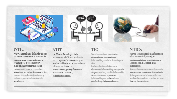 Nuevas Tecnologías de la Información y la Conectividad (NTICx), si analizamos la base tecnológica de la Sociedad Red, o Sociedad de la InformaciónAparece la incorporación del concepto nuevo que no es más que la resultante de los procesos de la innovación y de cambiar la mirada en cuanto a los usos de estas herramientas.