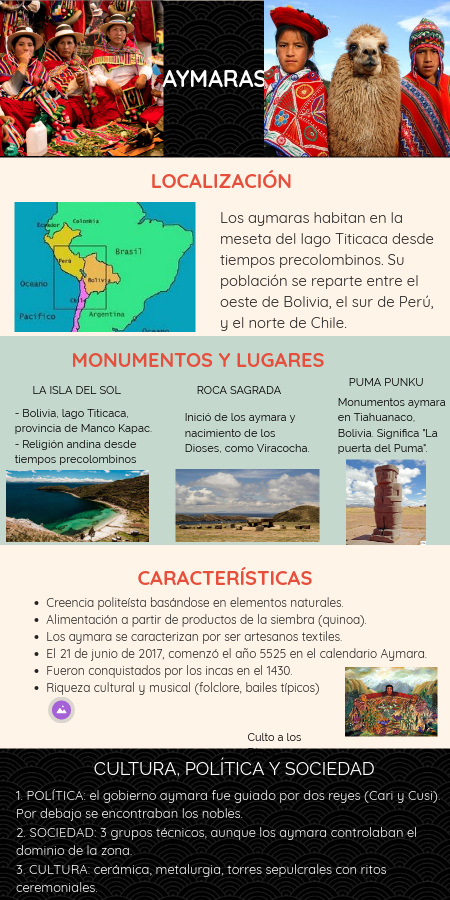1. POLÍTICA: el gobierno aymara fue guiado por dos reyes (Cari y Cusi). Por debajo se encontraban los nobles.2. SOCIEDAD: 3 grupos técnicos, aunque los aymara controlaban el dominio de la zona.3. CULTURA: cerámica, metalurgia, torres sepulcrales con ritos ceremoniales.