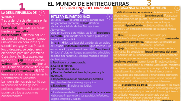 En 1919, Hitler se afilió al DAP, partido que luego pasó a llamarse NSDAP (Partido Nacionalsocialista de los Trabajadores Alemanes).Creó un cuerpo paramilitar, las SA o Secciones de Asalto, para mantener el orden público en los actos del partido. En 1923, Hitler, ya líder del partido, da un golpe de Estado (Putsch de Múnich), que fracasó. Fue encarcelado, y es cuando escribió Mein Kampf, "Mi lucha", obra en la que plasmó los principios básicos del nazismo. Recogía muchos rasgos del fascismo: 1. Rechazo a la democracia. 2. Culto al Führer. 3. Primacía del Estado. 4. Exaltación de la violencia, la guerra y la juventud. 5. Importancia de los símbolos y desfiles. Pero también tendrá rasgos propios: 1. El racismo. El odio a los judios (antisemitismo). 2. La defensa de la superioridad de la raza aria. Había que imponerse a los pueblos inferiores, latinos, eslavos y judíos. 3. El espacio vital. Los arios podían conquistar territorios de otros paises.