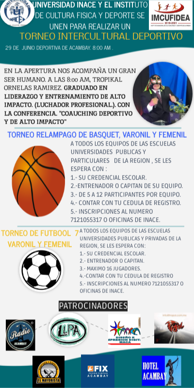 A TODOS LOS EQUIPOS DE LAS ESCUELAS UNIVERSIDADES PUBLICAS Y PRIVADAS DE LA REGION, SE LES ESPERA CON:1.- SU CREDENCIAL ESCOLAR. 2.- ENTRENADOR O CAPITAN. 3.- MAXIMO 16 JUGADORES. 4.-CONTAR CON TU CEDULA DE REGISTRO 5.- INSCRIPCIONES AL NUMERO 7121055317 O OFICINAS DE INACE.