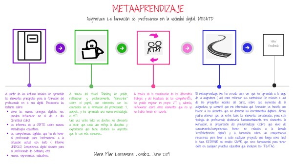 El metaaprendizaje me ha servido para ver que he aprendido a lo largo de la asignatura ( así, como reforzar sus contenidos). En relación a una de las preguntas iniciales del curso, sobre que esperaba de la asignatura, yo comenté que me interesaba qué formación se tendría que hacer a los docentes que no dominan las herramientas digitales. Ahora, podría afirmar que, de entre todos los elementos considerados, para esta tipología de profesorado, destacaría fundamentalmente tres elementos: la motivación, la preparación del preaprendizaje (sobre que nivel de conocimientos/competencias tienen en relación a la llamada "realfabetización digital") y la formación sobre las competencias necesarias para llevar a cabo cualquier proyecto que tenga como final, la fase REDIFINIR del modelo SAMR, que creo fundamental para tener éxito en cualquier práctica educativa que involucre las TIC/TAC.