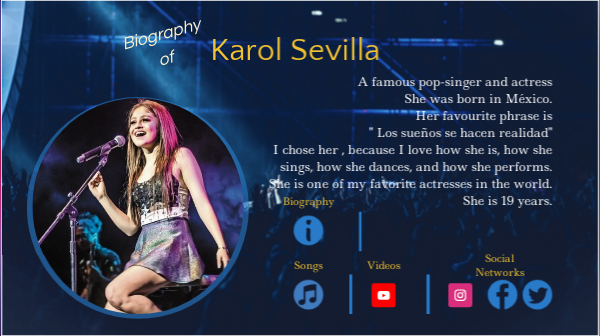 A famous pop-singer and actress She was born in México. Her favourite phrase is " Los sueños se hacen realidad" I chose her , because I love how she is, how she sings, how she dances, and how she performs. She is one of my favorite actresses in the world. She is 19 years.
