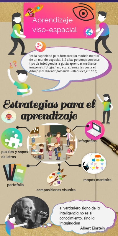 "es la capacidad para formarce un modelo mental de un mundo espacial, (...) a las personas con este tipo de inteligencia le gusta aprender mediante imagenes, fotografias , etc. ademas les gusta el dibujo y el diseño"(gamandé-villanueva,2014:15)