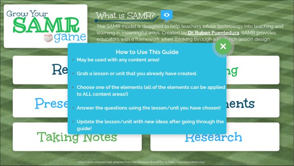 The SAMR model is designed to help teachers infuse technology into teaching and learning in meaningful ways. Created by Dr. Ruben Puentedura, SAMR provides educators with a framework when thinking through a tech-rich lesson design.