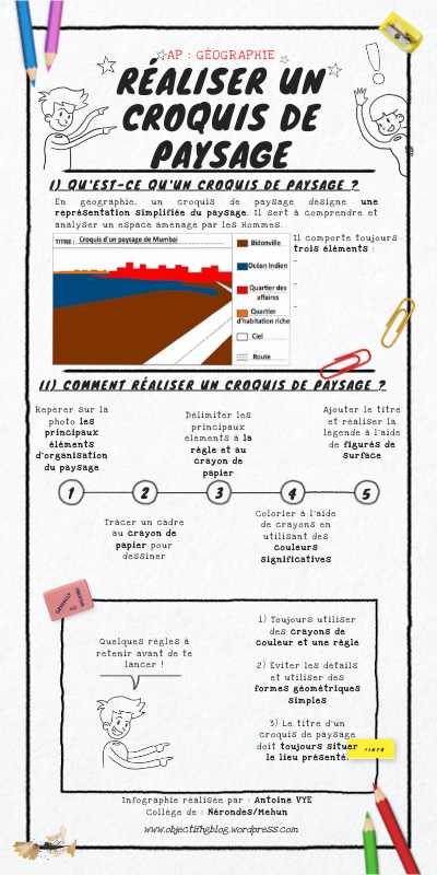 1) Toujours utiliser des crayons de couleur et une règle2) Eviter les détails et utiliser des formes géométriques simples 3) Le titre d'un croquis de paysage doit toujours situer le lieu présenté.
