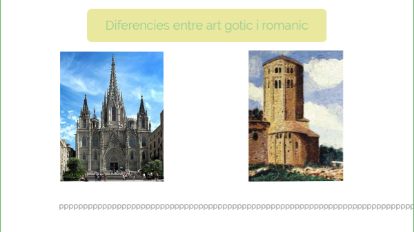 En l'art romanic els arcs eran arcs de mig punt i a l'art gotic els arcs s'anomenaven arcs apuntats o ogivals.En l'art romanic no hi havien pinacles i a l'art gotic si que hi havien. En l'art romanic no hi havien gargoles i a l'art gotic si que hi havien. En 'art gotic hi havien mes finestres que al romanic.