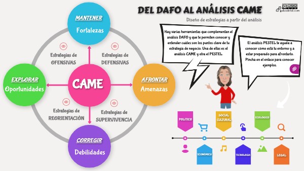 Hay varias herramientas que complementan el análisis DAFO y que te permiten conocer y entender cuáles son los puntos clave de tu estrategia de negocio. Una de ellas es el análisis CAME y otra el PESTEL.