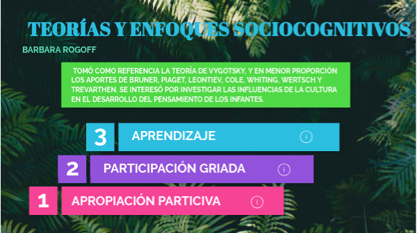 Tomó como referencia la teoría de Vygotsky, y en menor proporción los aportes de Bruner, Piaget, Leontiev, Cole, Whiting, Wertsch y Trevarthen. Se interesó por investigar las influencias de la cultura en el desarrollo del pensamiento de los infantes.