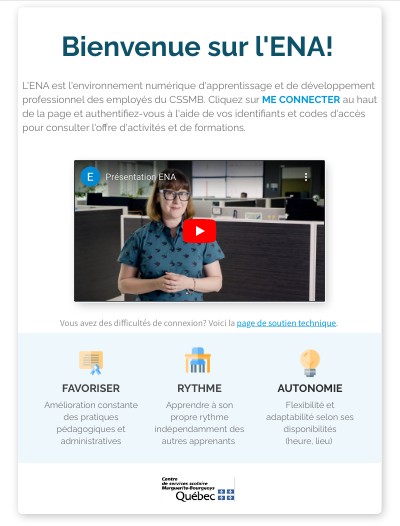L'ENA est l'environnement numérique d'apprentissage et de développement professionnel des employés du CSSMB. Cliquez sur ME CONNECTER au haut de la page et authentifiez-vous à l'aide de vos identifiants et codes d'accès pour consulter l'offre d'activités et de formations.