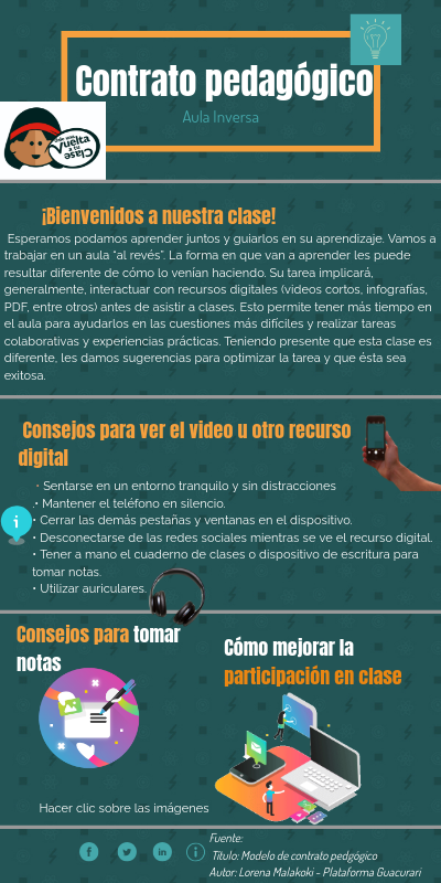 Esperamos podamos aprender juntos y guiarlos en su aprendizaje. Vamos a trabajar en un aula “al revés”. La forma en que van a aprender les puede resultar diferente de cómo lo venían haciendo. Su tarea implicará, generalmente, interactuar con recursos digitales (videos cortos, infografías, PDF, entre otros) antes de asistir a clases. Esto permite tener más tiempo en el aula para ayudarlos en las cuestiones más difíciles y realizar tareas colaborativas y experiencias prácticas. Teniendo presente que esta clase es diferente, les damos sugerencias para optimizar la tarea y que ésta sea exitosa.
