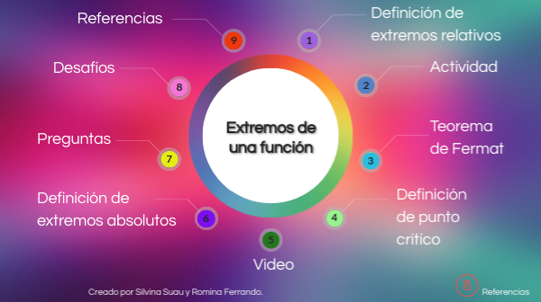 REFERENCIAS• Stewart, J. (2008) "Cálculo de una variable. Trascendentes tempranas". Editorial Thomson Learning Publishers. 6ª Edición. ISBN: 978-970-686-653-0 • Larson, R; Edwards, B. (2008) "Cálculo 1 de una variable". Editorial Mc Graw-Hill. 9ª Edición. ISBN 978-607-15-0273-5 • Khan Academy: https://es.khanacademy.org/