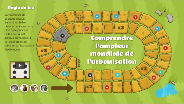 Lancez le dé en cliquant dessus. Suivant le chiffre obtenu, .avancez votre pion case par case. Faites ce qui est indiqué sur la case. Il est obligatoire de s'arréter sur les cases à étoile rouge.
