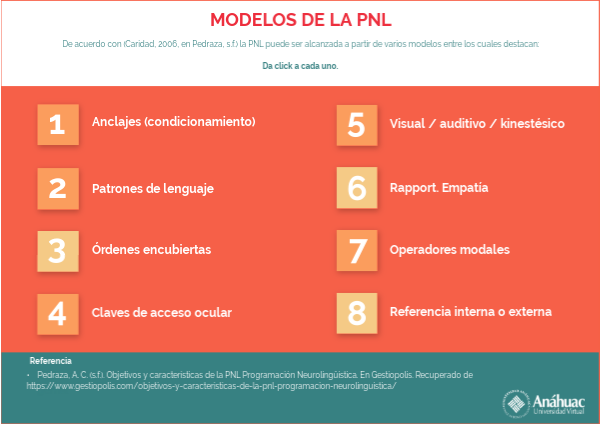 De acuerdo con (Caridad, 2006, en Pedraza, s.f.) la PNL puede ser alcanzada a partir de varios modelos entre los cuales destacan: Da click a cada uno.