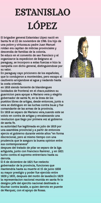 El brigadier general Estanislao López nació en Santa fe el 22 de noviembre de 1786. Era hijo de una pobre y virtuosa.su padre Juan Manuel roldan era capitan de milicias provinciales y descendia de familias de la colonia.Se educo en el convento de san francisco y al organizarce la expedicion de Belgrano al paraguay, se incorporo a estas fuerzas e hizo la campaña con dicho general, distinguiendose por su valor. En paraguay cayo pricionero de los españoles, que lo condujeron a montevideo, pero escapo al cautiverio arrojandose al agua y nadando hasta la costa oriental. en 1816 siendo teniente de blandengues (soldados de frontera) en el chaco,sublevo su guarnicion para apoyar a Mariano vera y elegirlo gobernador de santa fe, en la linea de los pueblos libres de artigas, desde entonces, junto a vera se distinguio en las luchas contra bs.as y fue comandante de las armas de la provincia. En 1818 se separo de Mariano vera,cuando este se volvio en contra de artigas y encabezando una revolucion que llego por primera vez al gobierno de santa fe. su autoridad fue legitimada en julio de 1819 por una asamblea provincial y a partir de entonces ejercio el gobierno durante veinte años "en forma discrecional, pero al mismo tiempo con una prudencia que le aseguro la buena opinion entre sus contemporaneos" despues del tratado de pilar se separo de la liga artiguista, junto con Francisco Ramirez , y en 1821 lucho contra el supremo entrerriano hasta su derrota. El 6 de diciembre de 1821 fue reelecto gobernador de la provincia, funciones que mantendria hasta su muerte el 15 de junio 1838 su mayor prestigio y poder fue ejercido entre 1828 y 1835, despues del motin de lavalle.En 1829 la representacion nacional reunida en santa fe lo designo jefe del ejercito nacional destinado a kluchar contra lavalle, a quien derroto en puente de Marquez, con el apoyo de Rosas.