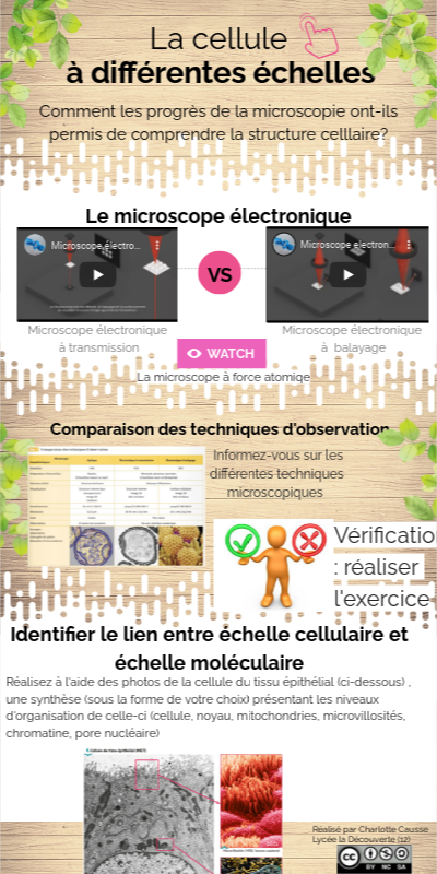 Réalisez à l'aide des photos de la cellule du tissu épithélial (ci-dessus) , une synthèse (sous la forme de votre choix) présentant les niveaux d'organisation de celle-ci (cellule, noyau, mitochondries, microvillosités, chromatine, pore nucléaire)