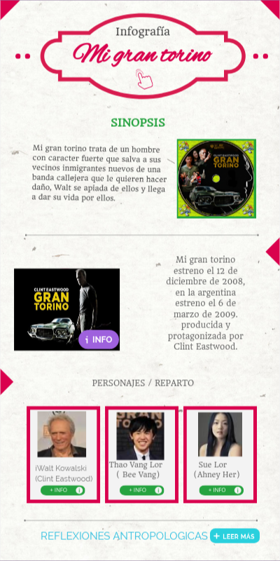 Mi gran torino trata de un hombre con caracter fuerte que salva a sus vecinos inmigrantes nuevos de una banda callejera que le quieren hacer daño, Walt se apiada de ellos y llega a dar su vida por ellos.