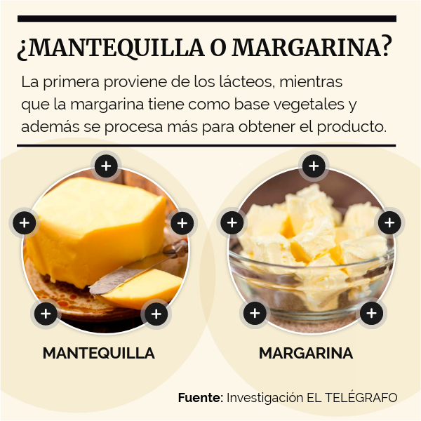 La primera proviene de los lácteos, mientras que la margarina tiene como base vegetales y además se procesa más para obtener el producto.