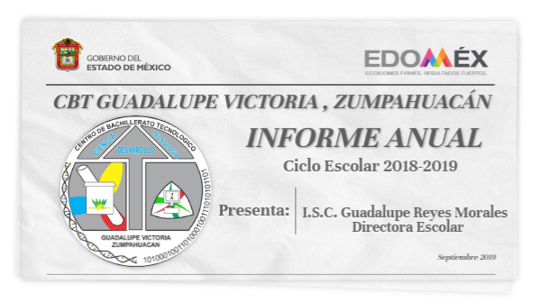 En atención al cumplimiento de los directivos que encaminaron el destino de nuestro plantel aportando sus ideas, conocimientos y experiencias, agradecemos al Profesor Antonio Valdés Herrera quien fungió como director del CBT Guadalupe Victoria, Zumpahuacán durante el ciclo escolar 2018 – 2019. Por lo tanto, se presentan las actividades desarrolladas del ciclo Escolar 2018 – 2019, ante el Supervisor Escolar de la Zona BT002 profesor Sergio Mérida Trujillo, los directores de las Instituciones que integran esta zona, docentes, padres de familia y alumnos. En el presente informe se describen los proyectos, acciones, compromisos y logros de nuestra institución, e integra las aportaciones de las áreas que forman parte de nuestra comunidad educativa, dejando constancia del esfuerzo y dedicación para el bien de nuestros alumnos.