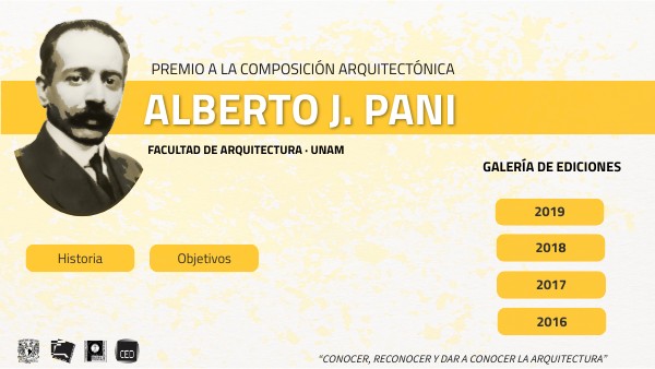 La historia del Premio se divide en tres etapas: La primera etapa comienza con su fundación en 1947, cuando se constituyó el fondo con una donación del Ing. Alberto J. Pani para otorgar un premio anual entre los estudiantes de la entonces Escuela Nacional de Arquitectura (ENA) de la UNAM que se distinguieran por su desempeño en el área de la composición arquitectónica y el trabajo en equipo.