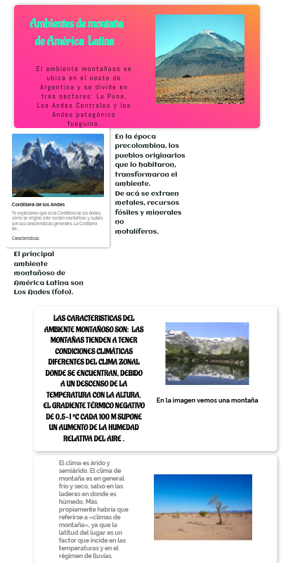 El ambiente montañoso se ubica en el oeste de Argentina y se divide en tres sectores: La Puna, Los Andes Centrales y los Andes patagónico fueguino.