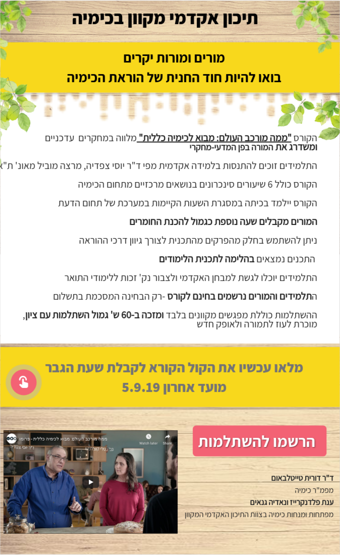 הקורס "ממה מורכב העולם: מבוא לכימיה כללית" מלווה במחקרים עדכניים ומשדרג את המורה בפן המדעי-מחקרי התלמידים זוכים להתנסות בלמידה אקדמית מפי ד"ר יוסי צפדיה, מרצה מוביל מאונ' ת"א הקורס כולל 6 שיעורים סינכרונים בנושאים מרכזיים מתחום הכימיה הקורס יילמד בכיתה במסגרת השעות הקיימות במערכת של תחום הדעת המורים מקבלים שעה נוספת כגמול להכנת החומרים ניתן להשתמש בחלק מהפרקים מהתכנית לצורך גיוון דרכי ההוראה התכנים נמצאים בהלימה לתכנית הלימודים התלמידים יוכלו לגשת למבחן האקדמי ולצבור נק' זכות ללימודי התואר התלמידים והמורים נרשמים בחינם לקורס -רק הבחינה המסכמת בתשלום ההשתלמות כוללת מפגשים מקוונים בלבד ומזכה ב-60 ש' גמול השתלמות עם ציון, מוכרת לעוז לתמורה ולאופק חדש