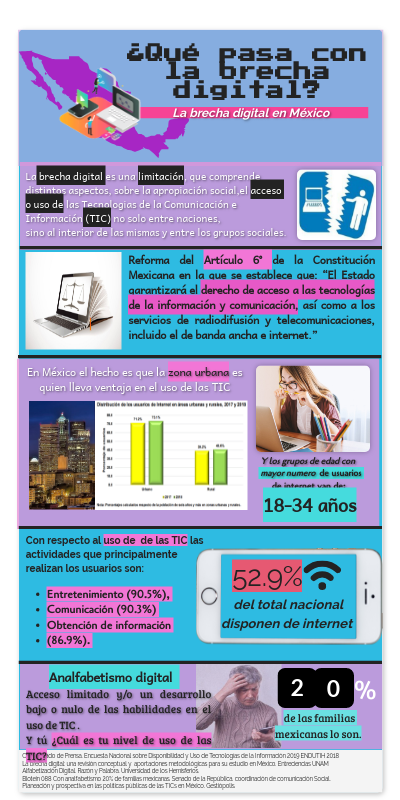 Comunicado de Prensa. Encuesta Nacional sobre Disponibilidad y Uso de Tecnologías de la Información 2019 ENDUTIH 2018La brecha digital: una revisión conceptual y aportaciones metodológicas para su estudio en México. Entreciencias UNAM Alfabetización Digital. Razón y Palabra. Universidad de los Hemisferios. Blotein 088 Con analfabetismo 20% de familias mexicanas. Senado de la República. coordinación de comunicación Social. Planeación y prospectiva en las políticas públicas de las TICs en México. Gestiópolis.