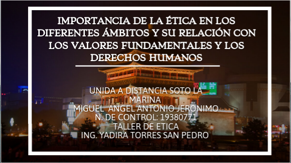 UNIDA A DISTANCIA SOTO LA MaRINA MIGUEL ANGEL ANTONIO JERONIMO N. DE CONTROL: 19380771 TALLER DE ETICA Ing. Yadira Torres San Pedro