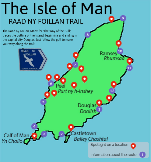 The Raad ny Foillan, Manx for 'The Way of the Gull', traces the outline of the Island, beginning and ending in the capital city Douglas. Just follow the gull to make your way along the trail!