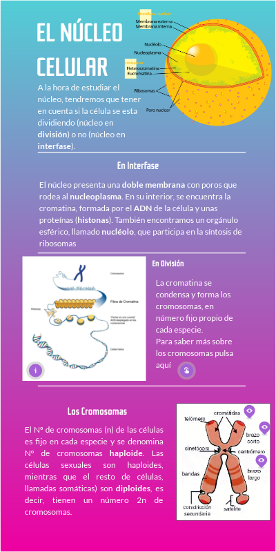 A la hora de estudiar el núcleo, tendremos que tener en cuenta si la célula se esta dividiendo (núcleo en división) o no (núcleo en interfase).