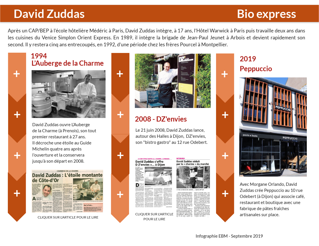 Le 21 juin 2008, David Zuddas lance, autour des Halles à Dijon, DZ'envies, son "bistro gastro" au 12 rue Odebert.